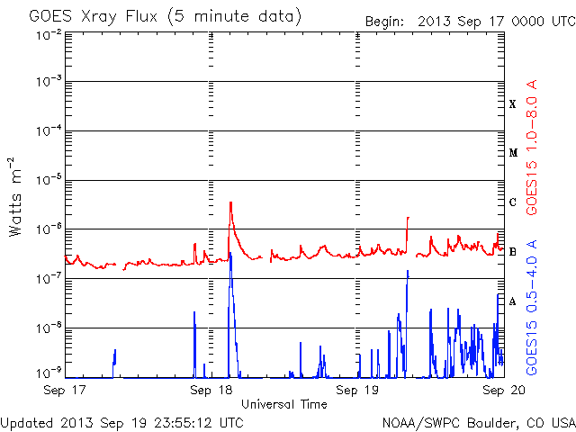 De operationele data in de bovenstaande grafiek werd aangepast om de schaalfactor te verwijderen die werd toegepast door het Space Weather Prediction Center (SWPC). Vanwege de SWPC-schaalfactor in de operationele data werden de zonnevlammen 42% kleiner gerapporteerd dan deze in de wetenschappelijke data. De schaalfactor werd ook verwijderd uit de lijst met zonnevlammen om de werkelijke fysieke eenheden weer te geven.