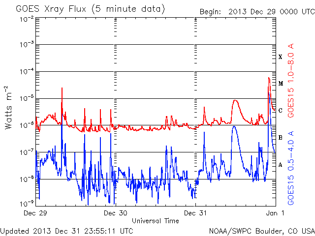 De operationele data in de bovenstaande grafiek werd aangepast om de schaalfactor te verwijderen die werd toegepast door het Space Weather Prediction Center (SWPC). Vanwege de SWPC-schaalfactor in de operationele data werden de zonnevlammen 42% kleiner gerapporteerd dan deze in de wetenschappelijke data. De schaalfactor werd ook verwijderd uit de lijst met zonnevlammen om de werkelijke fysieke eenheden weer te geven.