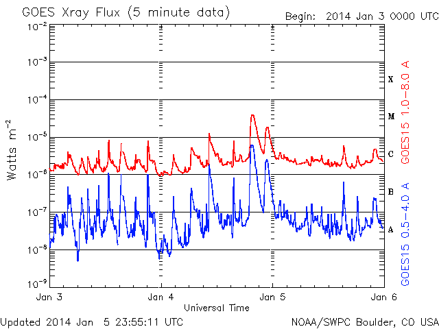De operationele data in de bovenstaande grafiek werd aangepast om de schaalfactor te verwijderen die werd toegepast door het Space Weather Prediction Center (SWPC). Vanwege de SWPC-schaalfactor in de operationele data werden de zonnevlammen 42% kleiner gerapporteerd dan deze in de wetenschappelijke data. De schaalfactor werd ook verwijderd uit de lijst met zonnevlammen om de werkelijke fysieke eenheden weer te geven.