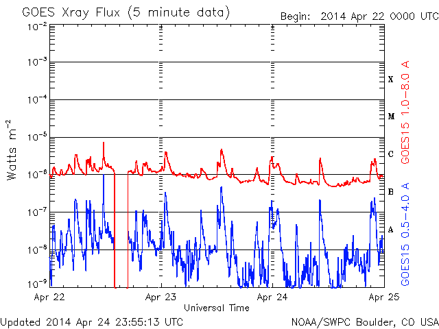 De operationele data in de bovenstaande grafiek werd aangepast om de schaalfactor te verwijderen die werd toegepast door het Space Weather Prediction Center (SWPC). Vanwege de SWPC-schaalfactor in de operationele data werden de zonnevlammen 42% kleiner gerapporteerd dan deze in de wetenschappelijke data. De schaalfactor werd ook verwijderd uit de lijst met zonnevlammen om de werkelijke fysieke eenheden weer te geven.