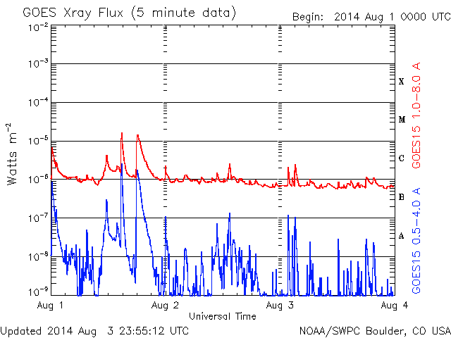 De operationele data in de bovenstaande grafiek werd aangepast om de schaalfactor te verwijderen die werd toegepast door het Space Weather Prediction Center (SWPC). Vanwege de SWPC-schaalfactor in de operationele data werden de zonnevlammen 42% kleiner gerapporteerd dan deze in de wetenschappelijke data. De schaalfactor werd ook verwijderd uit de lijst met zonnevlammen om de werkelijke fysieke eenheden weer te geven.