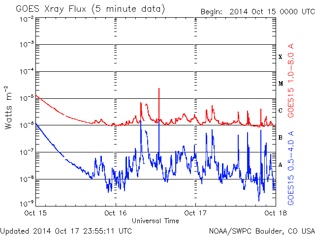 De operationele data in de bovenstaande grafiek werd aangepast om de schaalfactor te verwijderen die werd toegepast door het Space Weather Prediction Center (SWPC). Vanwege de SWPC-schaalfactor in de operationele data werden de zonnevlammen 42% kleiner gerapporteerd dan deze in de wetenschappelijke data. De schaalfactor werd ook verwijderd uit de lijst met zonnevlammen om de werkelijke fysieke eenheden weer te geven.