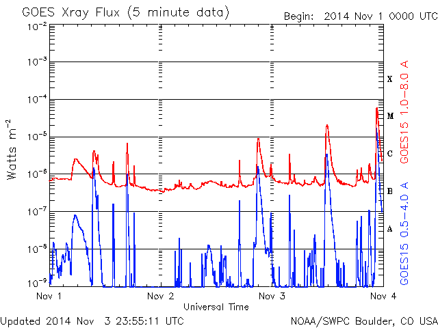 De operationele data in de bovenstaande grafiek werd aangepast om de schaalfactor te verwijderen die werd toegepast door het Space Weather Prediction Center (SWPC). Vanwege de SWPC-schaalfactor in de operationele data werden de zonnevlammen 42% kleiner gerapporteerd dan deze in de wetenschappelijke data. De schaalfactor werd ook verwijderd uit de lijst met zonnevlammen om de werkelijke fysieke eenheden weer te geven.