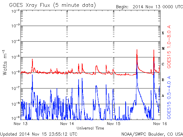 De operationele data in de bovenstaande grafiek werd aangepast om de schaalfactor te verwijderen die werd toegepast door het Space Weather Prediction Center (SWPC). Vanwege de SWPC-schaalfactor in de operationele data werden de zonnevlammen 42% kleiner gerapporteerd dan deze in de wetenschappelijke data. De schaalfactor werd ook verwijderd uit de lijst met zonnevlammen om de werkelijke fysieke eenheden weer te geven.