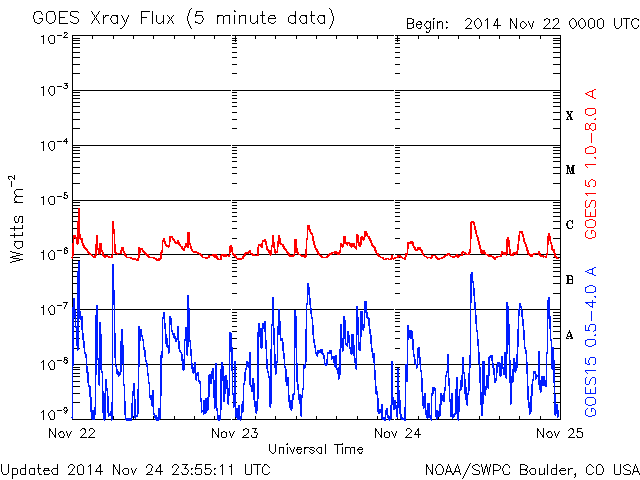 De operationele data in de bovenstaande grafiek werd aangepast om de schaalfactor te verwijderen die werd toegepast door het Space Weather Prediction Center (SWPC). Vanwege de SWPC-schaalfactor in de operationele data werden de zonnevlammen 42% kleiner gerapporteerd dan deze in de wetenschappelijke data. De schaalfactor werd ook verwijderd uit de lijst met zonnevlammen om de werkelijke fysieke eenheden weer te geven.