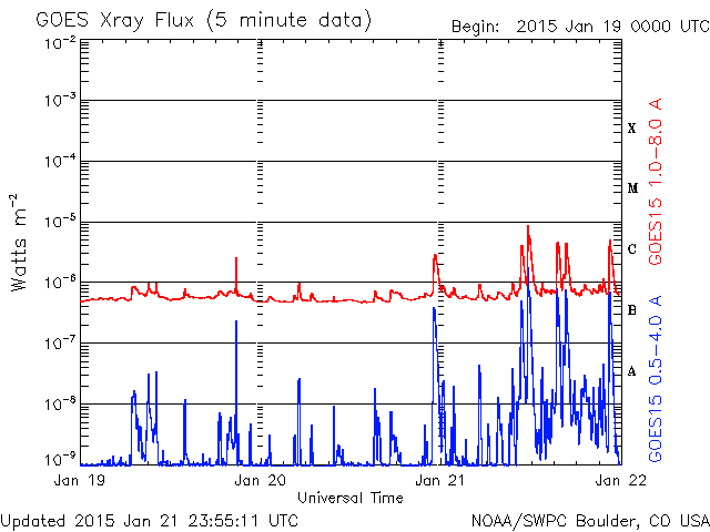 De operationele data in de bovenstaande grafiek werd aangepast om de schaalfactor te verwijderen die werd toegepast door het Space Weather Prediction Center (SWPC). Vanwege de SWPC-schaalfactor in de operationele data werden de zonnevlammen 42% kleiner gerapporteerd dan deze in de wetenschappelijke data. De schaalfactor werd ook verwijderd uit de lijst met zonnevlammen om de werkelijke fysieke eenheden weer te geven.