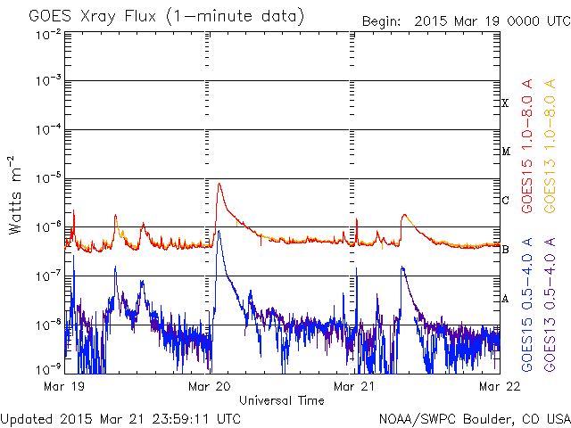 De operationele data in de bovenstaande grafiek werd aangepast om de schaalfactor te verwijderen die werd toegepast door het Space Weather Prediction Center (SWPC). Vanwege de SWPC-schaalfactor in de operationele data werden de zonnevlammen 42% kleiner gerapporteerd dan deze in de wetenschappelijke data. De schaalfactor werd ook verwijderd uit de lijst met zonnevlammen om de werkelijke fysieke eenheden weer te geven.