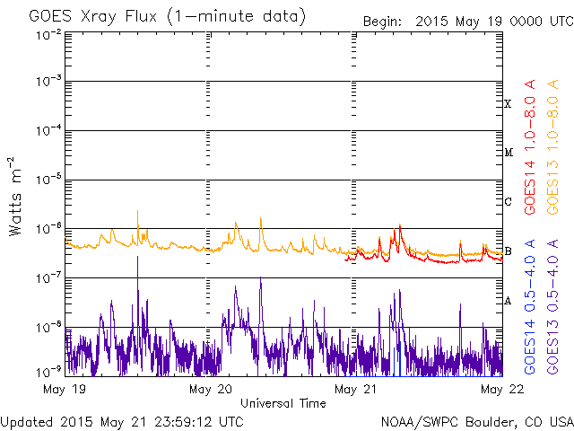 De operationele data in de bovenstaande grafiek werd aangepast om de schaalfactor te verwijderen die werd toegepast door het Space Weather Prediction Center (SWPC). Vanwege de SWPC-schaalfactor in de operationele data werden de zonnevlammen 42% kleiner gerapporteerd dan deze in de wetenschappelijke data. De schaalfactor werd ook verwijderd uit de lijst met zonnevlammen om de werkelijke fysieke eenheden weer te geven.