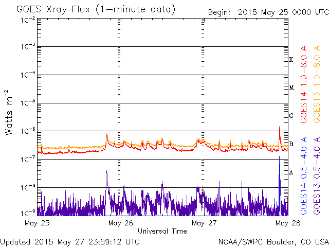De operationele data in de bovenstaande grafiek werd aangepast om de schaalfactor te verwijderen die werd toegepast door het Space Weather Prediction Center (SWPC). Vanwege de SWPC-schaalfactor in de operationele data werden de zonnevlammen 42% kleiner gerapporteerd dan deze in de wetenschappelijke data. De schaalfactor werd ook verwijderd uit de lijst met zonnevlammen om de werkelijke fysieke eenheden weer te geven.