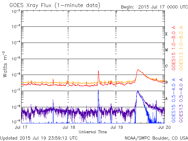 De operationele data in de bovenstaande grafiek werd aangepast om de schaalfactor te verwijderen die werd toegepast door het Space Weather Prediction Center (SWPC). Vanwege de SWPC-schaalfactor in de operationele data werden de zonnevlammen 42% kleiner gerapporteerd dan deze in de wetenschappelijke data. De schaalfactor werd ook verwijderd uit de lijst met zonnevlammen om de werkelijke fysieke eenheden weer te geven.