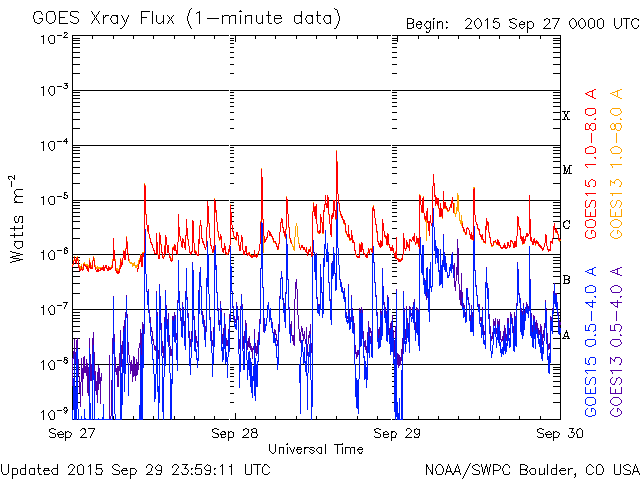 De operationele data in de bovenstaande grafiek werd aangepast om de schaalfactor te verwijderen die werd toegepast door het Space Weather Prediction Center (SWPC). Vanwege de SWPC-schaalfactor in de operationele data werden de zonnevlammen 42% kleiner gerapporteerd dan deze in de wetenschappelijke data. De schaalfactor werd ook verwijderd uit de lijst met zonnevlammen om de werkelijke fysieke eenheden weer te geven.