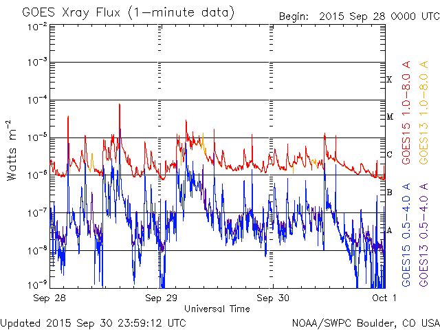 De operationele data in de bovenstaande grafiek werd aangepast om de schaalfactor te verwijderen die werd toegepast door het Space Weather Prediction Center (SWPC). Vanwege de SWPC-schaalfactor in de operationele data werden de zonnevlammen 42% kleiner gerapporteerd dan deze in de wetenschappelijke data. De schaalfactor werd ook verwijderd uit de lijst met zonnevlammen om de werkelijke fysieke eenheden weer te geven.