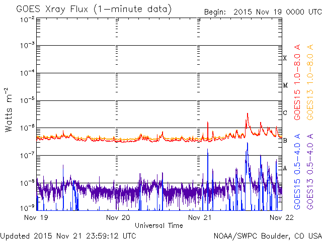 De operationele data in de bovenstaande grafiek werd aangepast om de schaalfactor te verwijderen die werd toegepast door het Space Weather Prediction Center (SWPC). Vanwege de SWPC-schaalfactor in de operationele data werden de zonnevlammen 42% kleiner gerapporteerd dan deze in de wetenschappelijke data. De schaalfactor werd ook verwijderd uit de lijst met zonnevlammen om de werkelijke fysieke eenheden weer te geven.