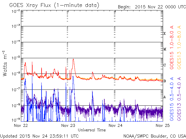De operationele data in de bovenstaande grafiek werd aangepast om de schaalfactor te verwijderen die werd toegepast door het Space Weather Prediction Center (SWPC). Vanwege de SWPC-schaalfactor in de operationele data werden de zonnevlammen 42% kleiner gerapporteerd dan deze in de wetenschappelijke data. De schaalfactor werd ook verwijderd uit de lijst met zonnevlammen om de werkelijke fysieke eenheden weer te geven.
