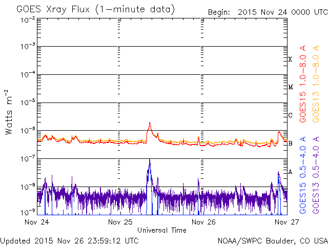 De operationele data in de bovenstaande grafiek werd aangepast om de schaalfactor te verwijderen die werd toegepast door het Space Weather Prediction Center (SWPC). Vanwege de SWPC-schaalfactor in de operationele data werden de zonnevlammen 42% kleiner gerapporteerd dan deze in de wetenschappelijke data. De schaalfactor werd ook verwijderd uit de lijst met zonnevlammen om de werkelijke fysieke eenheden weer te geven.