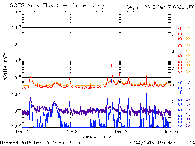De operationele data in de bovenstaande grafiek werd aangepast om de schaalfactor te verwijderen die werd toegepast door het Space Weather Prediction Center (SWPC). Vanwege de SWPC-schaalfactor in de operationele data werden de zonnevlammen 42% kleiner gerapporteerd dan deze in de wetenschappelijke data. De schaalfactor werd ook verwijderd uit de lijst met zonnevlammen om de werkelijke fysieke eenheden weer te geven.