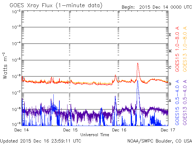De operationele data in de bovenstaande grafiek werd aangepast om de schaalfactor te verwijderen die werd toegepast door het Space Weather Prediction Center (SWPC). Vanwege de SWPC-schaalfactor in de operationele data werden de zonnevlammen 42% kleiner gerapporteerd dan deze in de wetenschappelijke data. De schaalfactor werd ook verwijderd uit de lijst met zonnevlammen om de werkelijke fysieke eenheden weer te geven.