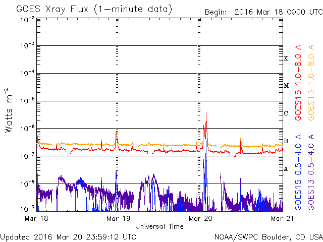 De operationele data in de bovenstaande grafiek werd aangepast om de schaalfactor te verwijderen die werd toegepast door het Space Weather Prediction Center (SWPC). Vanwege de SWPC-schaalfactor in de operationele data werden de zonnevlammen 42% kleiner gerapporteerd dan deze in de wetenschappelijke data. De schaalfactor werd ook verwijderd uit de lijst met zonnevlammen om de werkelijke fysieke eenheden weer te geven.