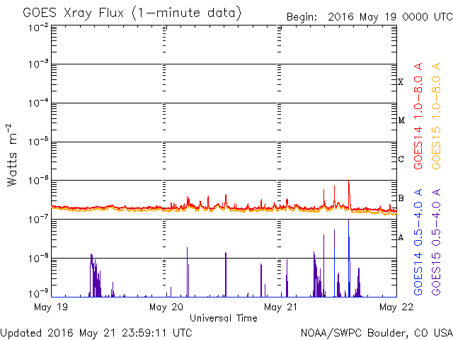 De operationele data in de bovenstaande grafiek werd aangepast om de schaalfactor te verwijderen die werd toegepast door het Space Weather Prediction Center (SWPC). Vanwege de SWPC-schaalfactor in de operationele data werden de zonnevlammen 42% kleiner gerapporteerd dan deze in de wetenschappelijke data. De schaalfactor werd ook verwijderd uit de lijst met zonnevlammen om de werkelijke fysieke eenheden weer te geven.