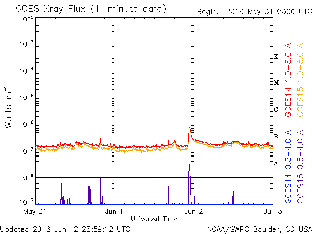 De operationele data in de bovenstaande grafiek werd aangepast om de schaalfactor te verwijderen die werd toegepast door het Space Weather Prediction Center (SWPC). Vanwege de SWPC-schaalfactor in de operationele data werden de zonnevlammen 42% kleiner gerapporteerd dan deze in de wetenschappelijke data. De schaalfactor werd ook verwijderd uit de lijst met zonnevlammen om de werkelijke fysieke eenheden weer te geven.
