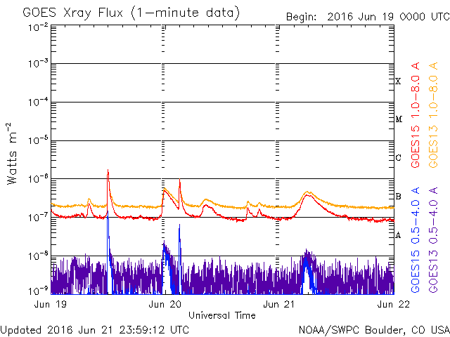 De operationele data in de bovenstaande grafiek werd aangepast om de schaalfactor te verwijderen die werd toegepast door het Space Weather Prediction Center (SWPC). Vanwege de SWPC-schaalfactor in de operationele data werden de zonnevlammen 42% kleiner gerapporteerd dan deze in de wetenschappelijke data. De schaalfactor werd ook verwijderd uit de lijst met zonnevlammen om de werkelijke fysieke eenheden weer te geven.