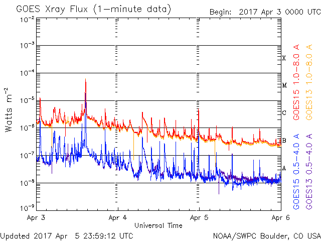 De operationele data in de bovenstaande grafiek werd aangepast om de schaalfactor te verwijderen die werd toegepast door het Space Weather Prediction Center (SWPC). Vanwege de SWPC-schaalfactor in de operationele data werden de zonnevlammen 42% kleiner gerapporteerd dan deze in de wetenschappelijke data. De schaalfactor werd ook verwijderd uit de lijst met zonnevlammen om de werkelijke fysieke eenheden weer te geven.