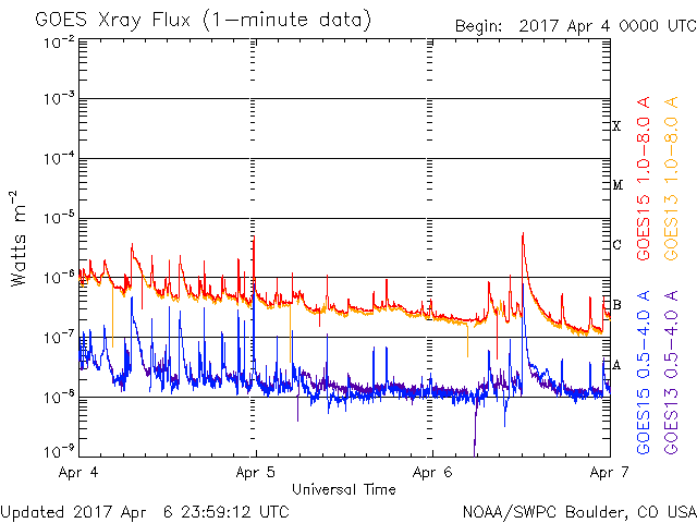 De operationele data in de bovenstaande grafiek werd aangepast om de schaalfactor te verwijderen die werd toegepast door het Space Weather Prediction Center (SWPC). Vanwege de SWPC-schaalfactor in de operationele data werden de zonnevlammen 42% kleiner gerapporteerd dan deze in de wetenschappelijke data. De schaalfactor werd ook verwijderd uit de lijst met zonnevlammen om de werkelijke fysieke eenheden weer te geven.