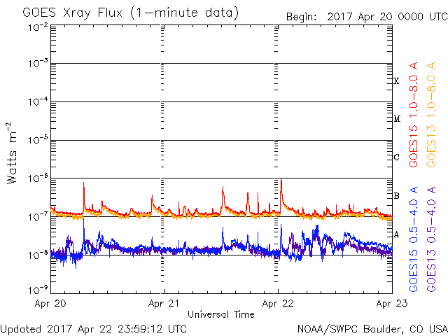 De operationele data in de bovenstaande grafiek werd aangepast om de schaalfactor te verwijderen die werd toegepast door het Space Weather Prediction Center (SWPC). Vanwege de SWPC-schaalfactor in de operationele data werden de zonnevlammen 42% kleiner gerapporteerd dan deze in de wetenschappelijke data. De schaalfactor werd ook verwijderd uit de lijst met zonnevlammen om de werkelijke fysieke eenheden weer te geven.