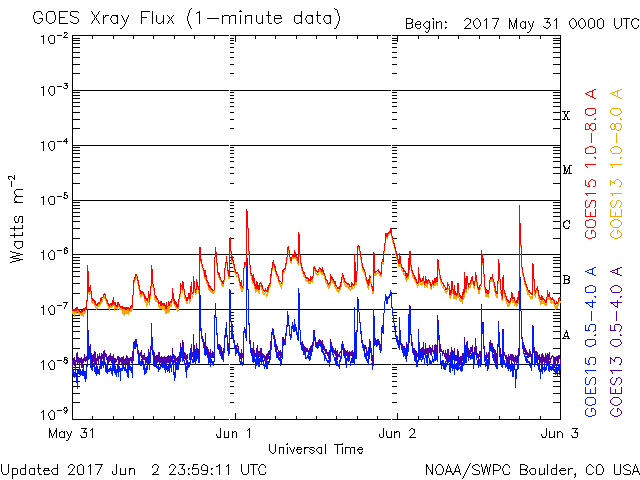 De operationele data in de bovenstaande grafiek werd aangepast om de schaalfactor te verwijderen die werd toegepast door het Space Weather Prediction Center (SWPC). Vanwege de SWPC-schaalfactor in de operationele data werden de zonnevlammen 42% kleiner gerapporteerd dan deze in de wetenschappelijke data. De schaalfactor werd ook verwijderd uit de lijst met zonnevlammen om de werkelijke fysieke eenheden weer te geven.