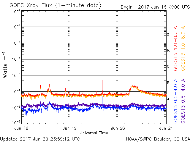 De operationele data in de bovenstaande grafiek werd aangepast om de schaalfactor te verwijderen die werd toegepast door het Space Weather Prediction Center (SWPC). Vanwege de SWPC-schaalfactor in de operationele data werden de zonnevlammen 42% kleiner gerapporteerd dan deze in de wetenschappelijke data. De schaalfactor werd ook verwijderd uit de lijst met zonnevlammen om de werkelijke fysieke eenheden weer te geven.