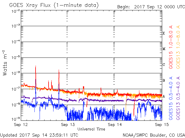 De operationele data in de bovenstaande grafiek werd aangepast om de schaalfactor te verwijderen die werd toegepast door het Space Weather Prediction Center (SWPC). Vanwege de SWPC-schaalfactor in de operationele data werden de zonnevlammen 42% kleiner gerapporteerd dan deze in de wetenschappelijke data. De schaalfactor werd ook verwijderd uit de lijst met zonnevlammen om de werkelijke fysieke eenheden weer te geven.