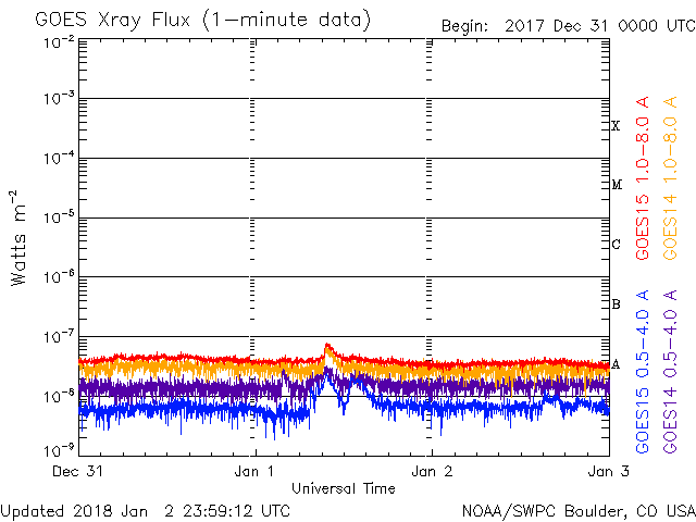 De operationele data in de bovenstaande grafiek werd aangepast om de schaalfactor te verwijderen die werd toegepast door het Space Weather Prediction Center (SWPC). Vanwege de SWPC-schaalfactor in de operationele data werden de zonnevlammen 42% kleiner gerapporteerd dan deze in de wetenschappelijke data. De schaalfactor werd ook verwijderd uit de lijst met zonnevlammen om de werkelijke fysieke eenheden weer te geven.