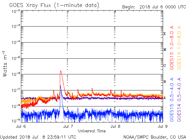 De operationele data in de bovenstaande grafiek werd aangepast om de schaalfactor te verwijderen die werd toegepast door het Space Weather Prediction Center (SWPC). Vanwege de SWPC-schaalfactor in de operationele data werden de zonnevlammen 42% kleiner gerapporteerd dan deze in de wetenschappelijke data. De schaalfactor werd ook verwijderd uit de lijst met zonnevlammen om de werkelijke fysieke eenheden weer te geven.