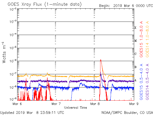 De operationele data in de bovenstaande grafiek werd aangepast om de schaalfactor te verwijderen die werd toegepast door het Space Weather Prediction Center (SWPC). Vanwege de SWPC-schaalfactor in de operationele data werden de zonnevlammen 42% kleiner gerapporteerd dan deze in de wetenschappelijke data. De schaalfactor werd ook verwijderd uit de lijst met zonnevlammen om de werkelijke fysieke eenheden weer te geven.
