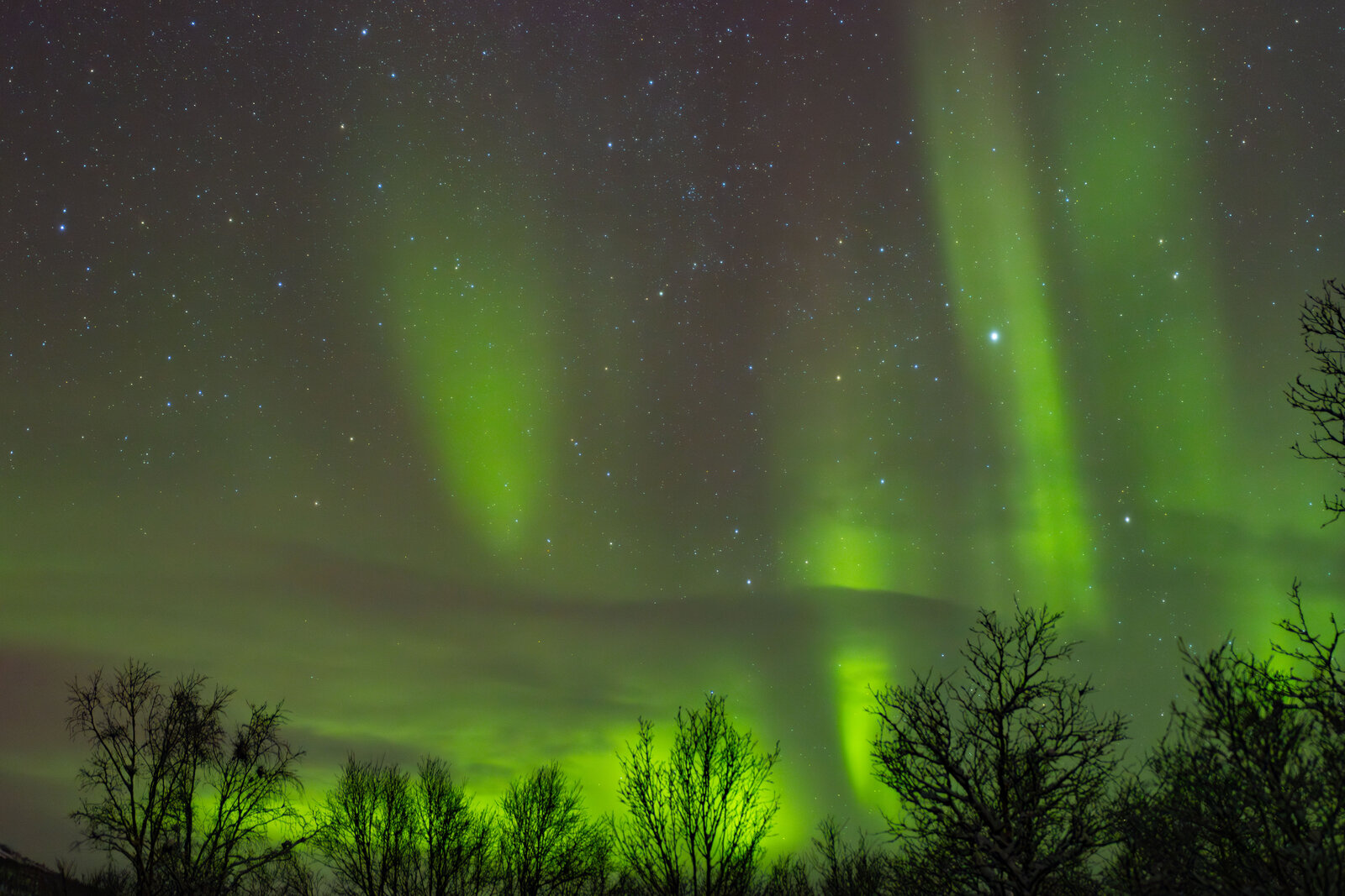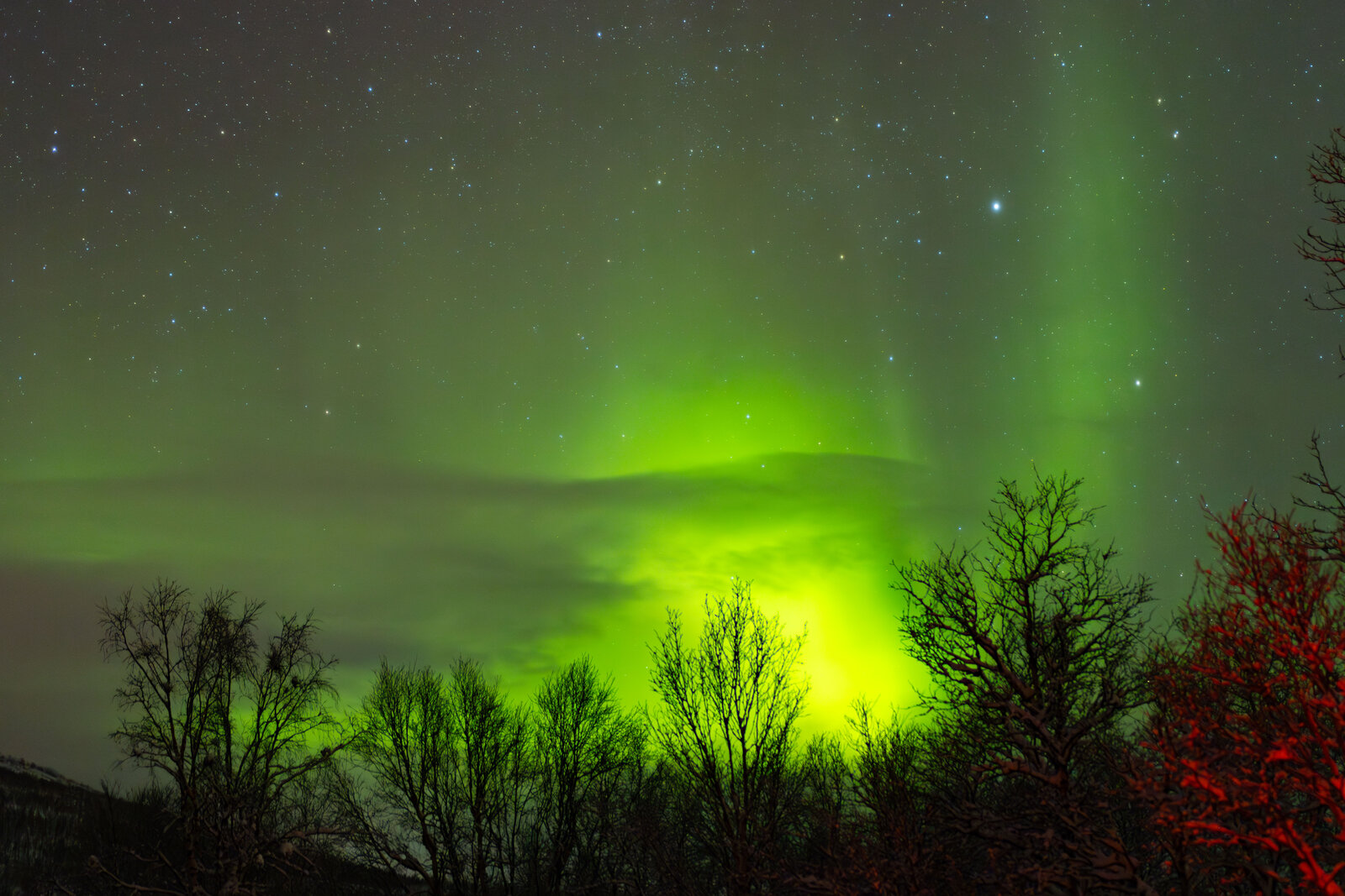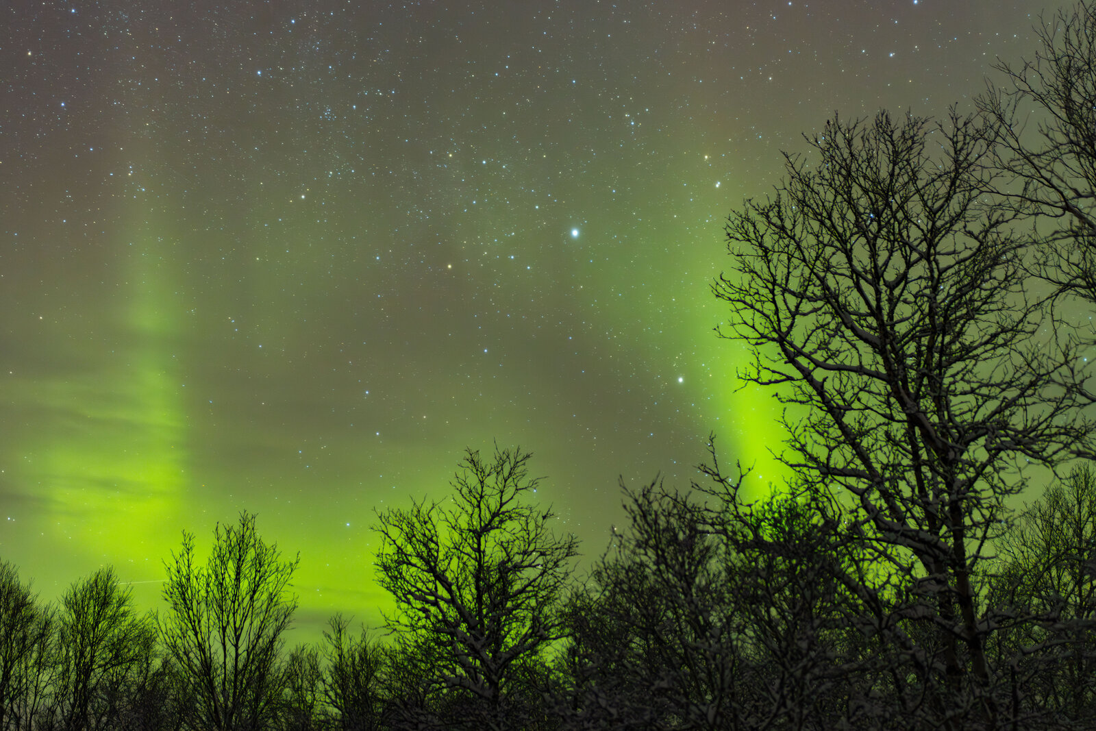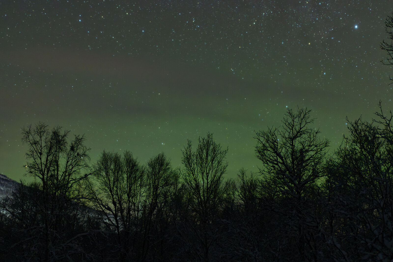 Faint aurora display with some brighter patches but mostly quiet.