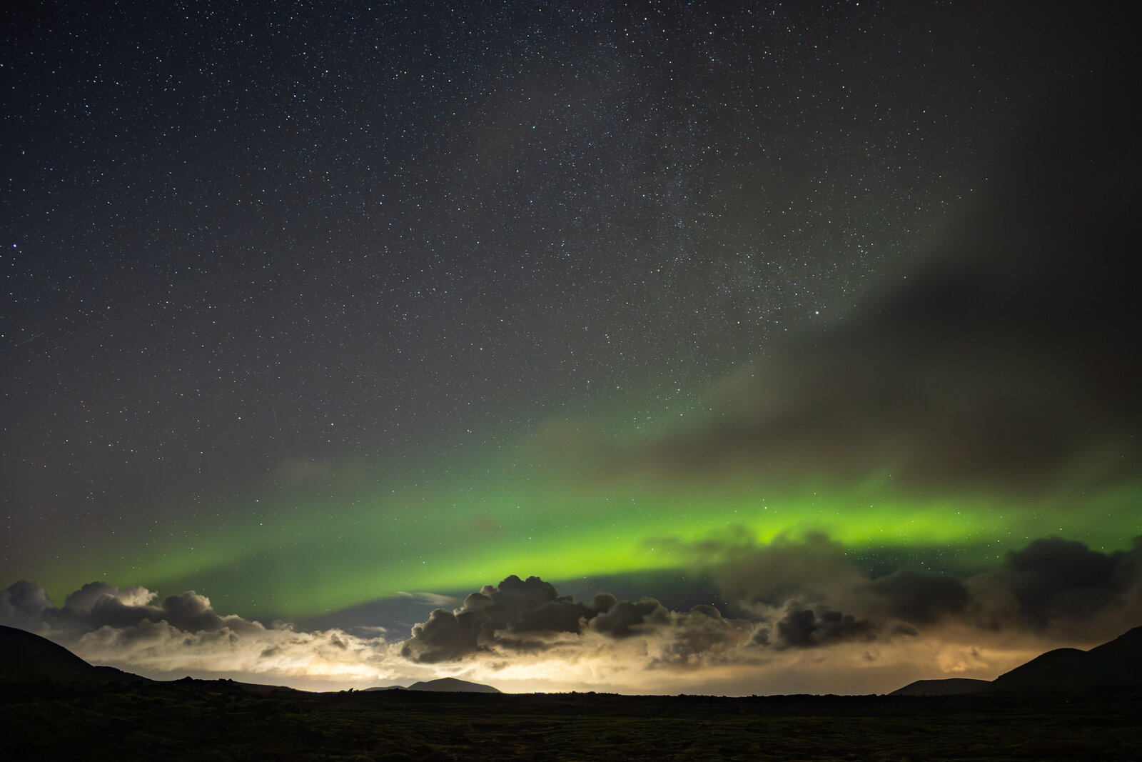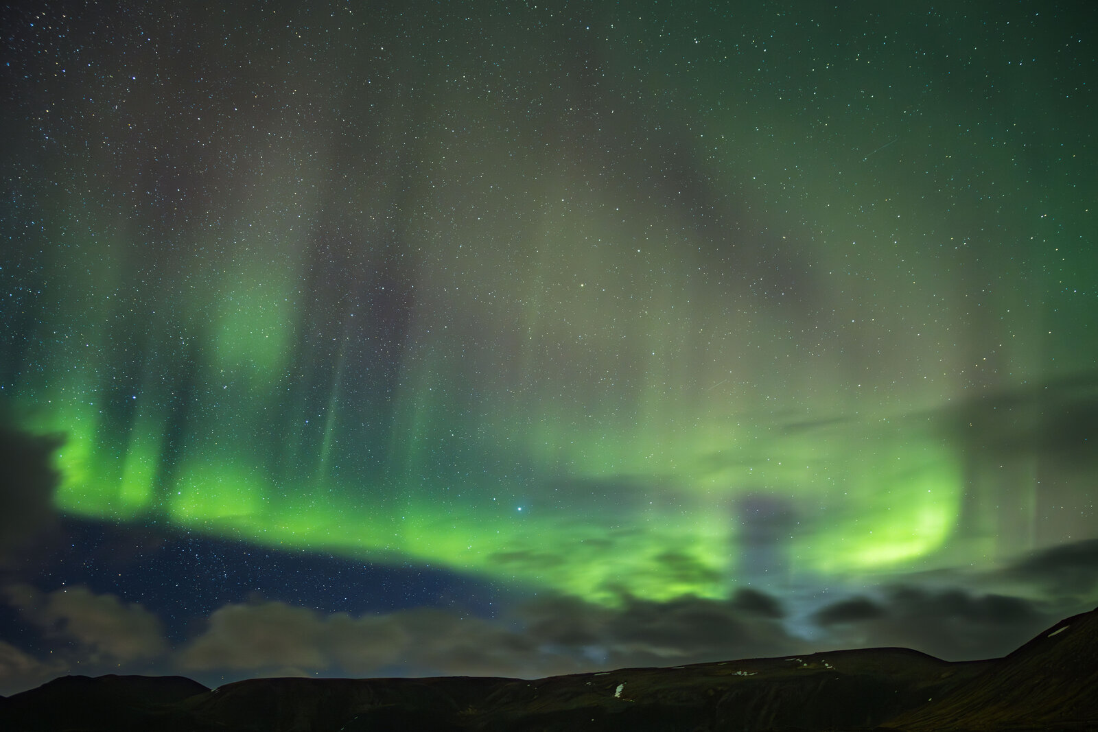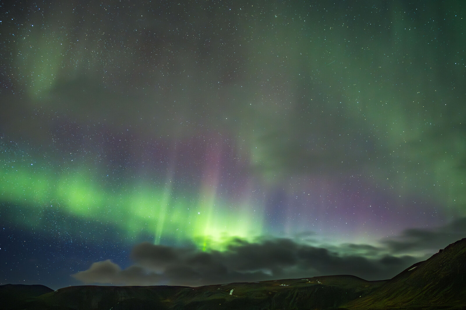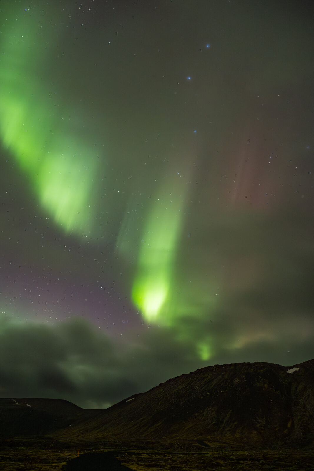 Our first aurora chasing night in Iceland, we found a good spot near Grindavik to go chase aurora. It appeared as a static arc at first with not that much movement. Suddenly in the north appeared some brighter and more active aurora with some nice streamers and rays visible and in photos also some red, really great to see.