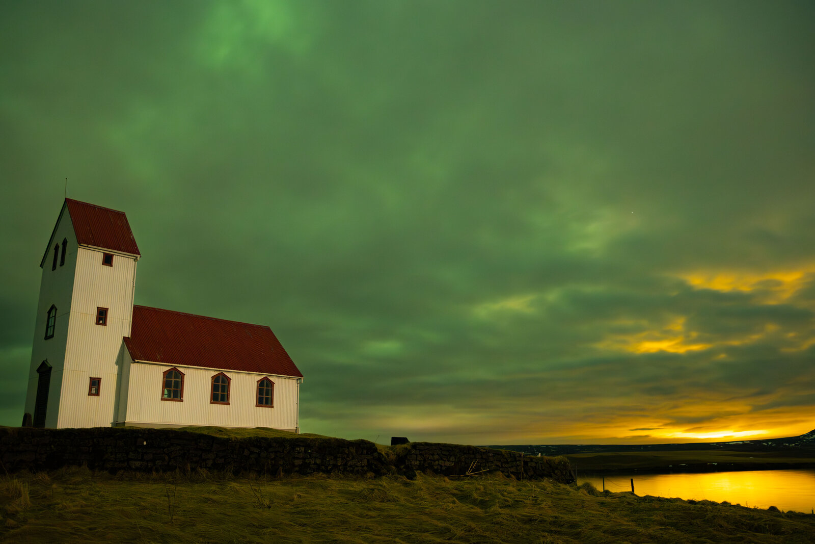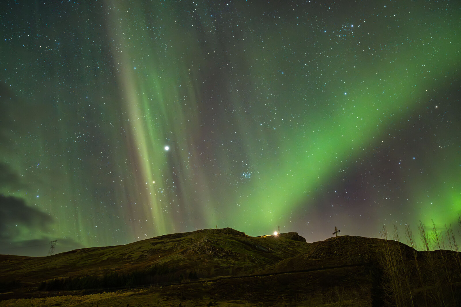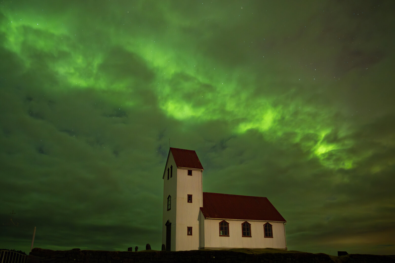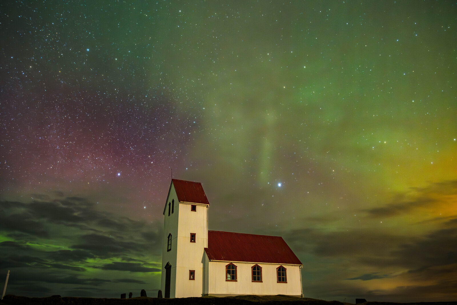 We didn't have much hope as it was very cloudy when we left for this aurora chase, during the day we found a good spot and at night we returned and waited for some clearings. It is sad to see that there was much light pollution in the east due to illumlinated greenhouses, although it gave the photo's a strange look. Even though it was very cloudy, the clouds were not normal as the aurora lighted up the clouds. Some breaks finaly appeared and the aurora could be seen through the small gaps that got bigfger at moments and a biut later it all cleared up although the most active part of the aurora was already past and it got more static but with many structures visible.