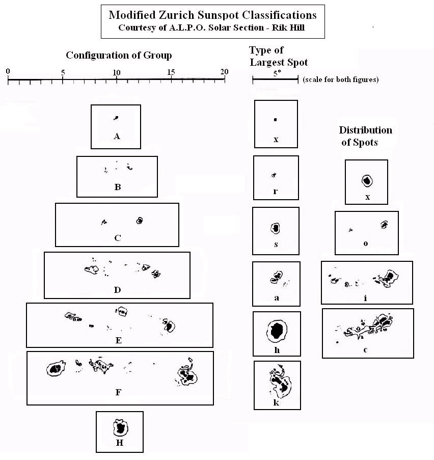 Elke dag wordt van elke zonnevlek zowel de magnetische classificatie als de vlek classificatie bepaald. Op onze website vindt u telkens het overzicht van de zonnevlekken op de zon, samen met hun magnetische classificatie en vlek classificatie. De vlek classificatie gebeurt dus op basis van het Zürich/McIntosh systeem. Hieronder vindt u wat dit precies betekent.