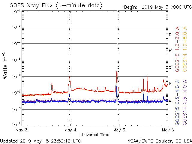 Оперативные данные выше были модифицированы, чтобы убрать масштабирующий фактор, который был применен SWPC (Центр предсказания космической погоды). Из-за этого фактора индексы вспышек в оперативных данных были занижены на 42% относительно научных данных. Масштабирующий фактор был так же убран из списка солнечных вспышек, чтобы отображать реальные величины.